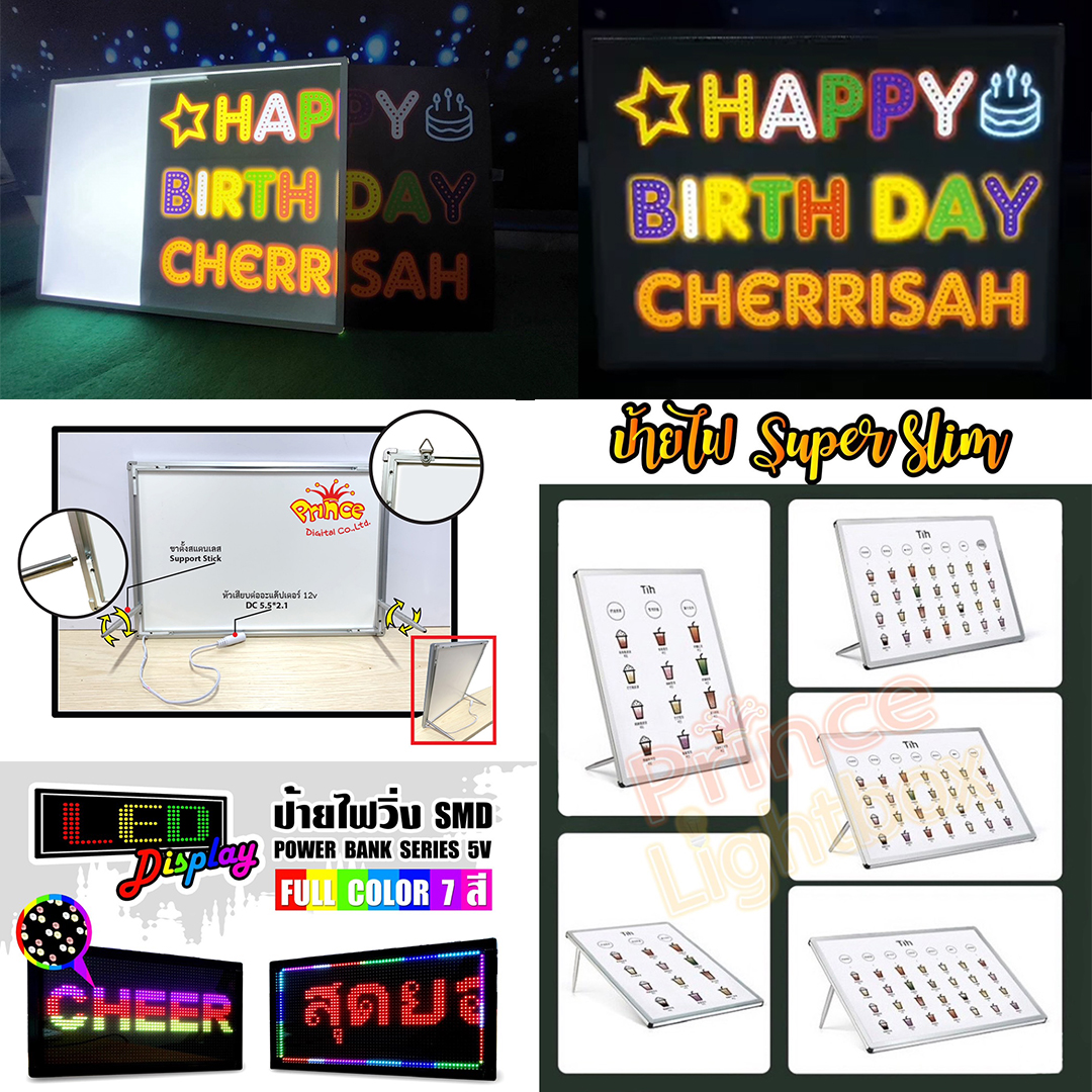 ลูกค้าท่านใดที่กำลังมองหาป้ายไฟเชียร์ที่ไม่เหมือนใคร เชิญทางนี้ได้เลย งานนป้าย Super Slim ที่สามารถเปลี่ยนงานพิมพ์เองได้ง่ายๆ หรือจะเป็นป้ายไฟวิ่งที่สามารถใช้งานกับpower bankได้ มีเอฟเฟคให้เล่นหลายรูปแบบ สำหรับคนไม่อยากถือทางร้านมีป้ายไฟแบบติดหน้าอก สามารถเปลี่ยนอักษรได้ตามต้องการ