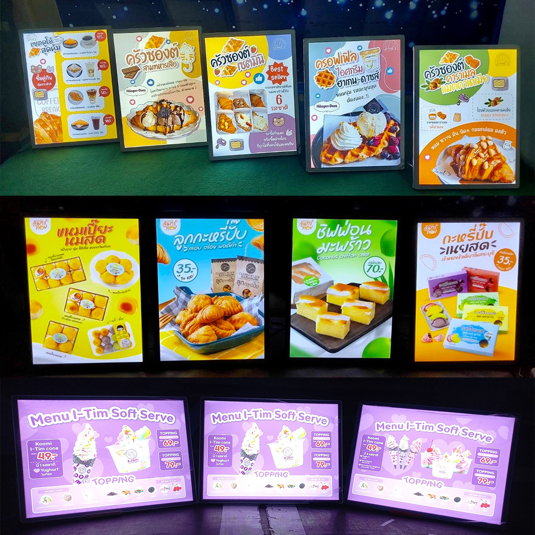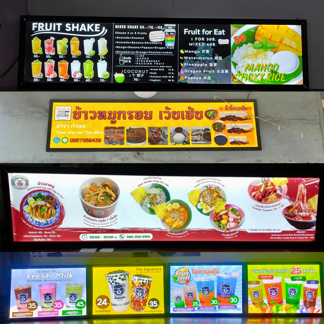 ป้ายไฟแนะนำรายการอาหาร ที่จะดึงดูดสายตา โดนเด่นจนลูกค้าต้องเข้าร้าน สามารถสั่งทำตามขนาดที่ต้องการได้ มีอุปกรณ์เสริมไม่ว่าจะเป็นขาตั้ง ขาแขวนเพดาน