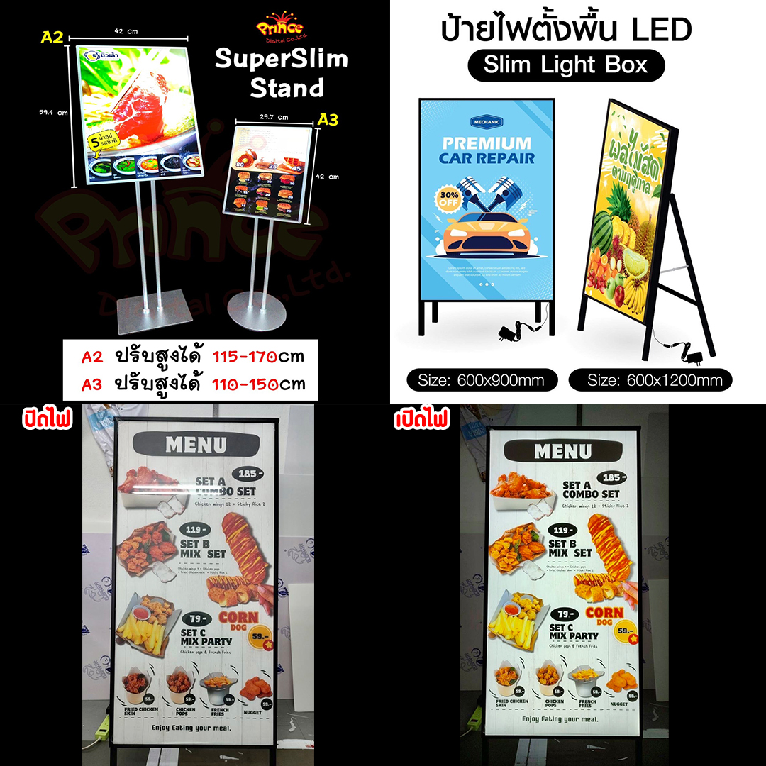 ป้ายไฟที่มาพร้อมขาตั้ง สามารถพับเก็บได้ง่าย สะดวก สบาย น้ำหนักเบา ใช้เป็นป้ายเมนูหน้าร้านหรือภายในร้าน โฆษณาบอกโปรโมชั่น
